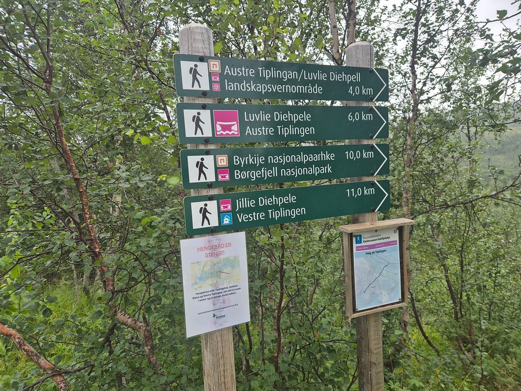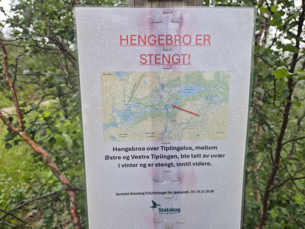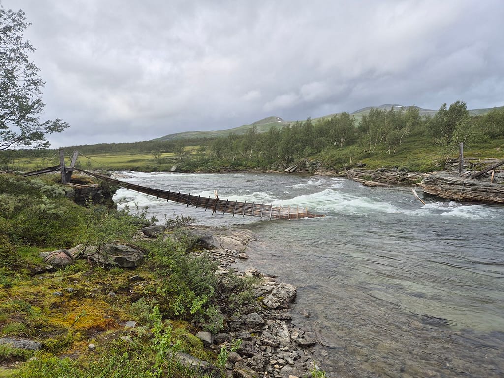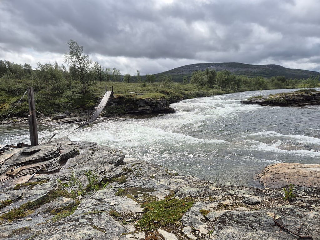 Ved Tiplingelva er det en bro som markerer starten på Børgefjell fra nordsiden. Det jeg ikke hadde fått med meg var at denne var blitt tatt av uvær i vinter og var helt ødelagt. Det ble derfor enda en solid vading. Det var en del strøm og bunnen på sekken kom tidvis litt ned i elva. Jeg kom meg likevel over uten for store problemer. På dette punktet var jeg litt lei av gjennomvåte klær.
