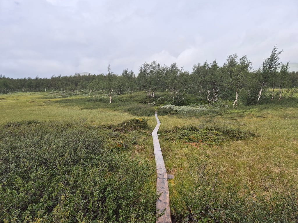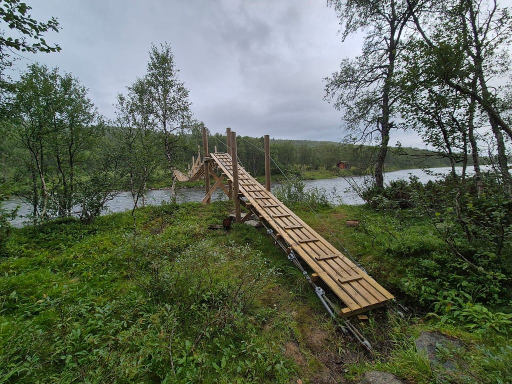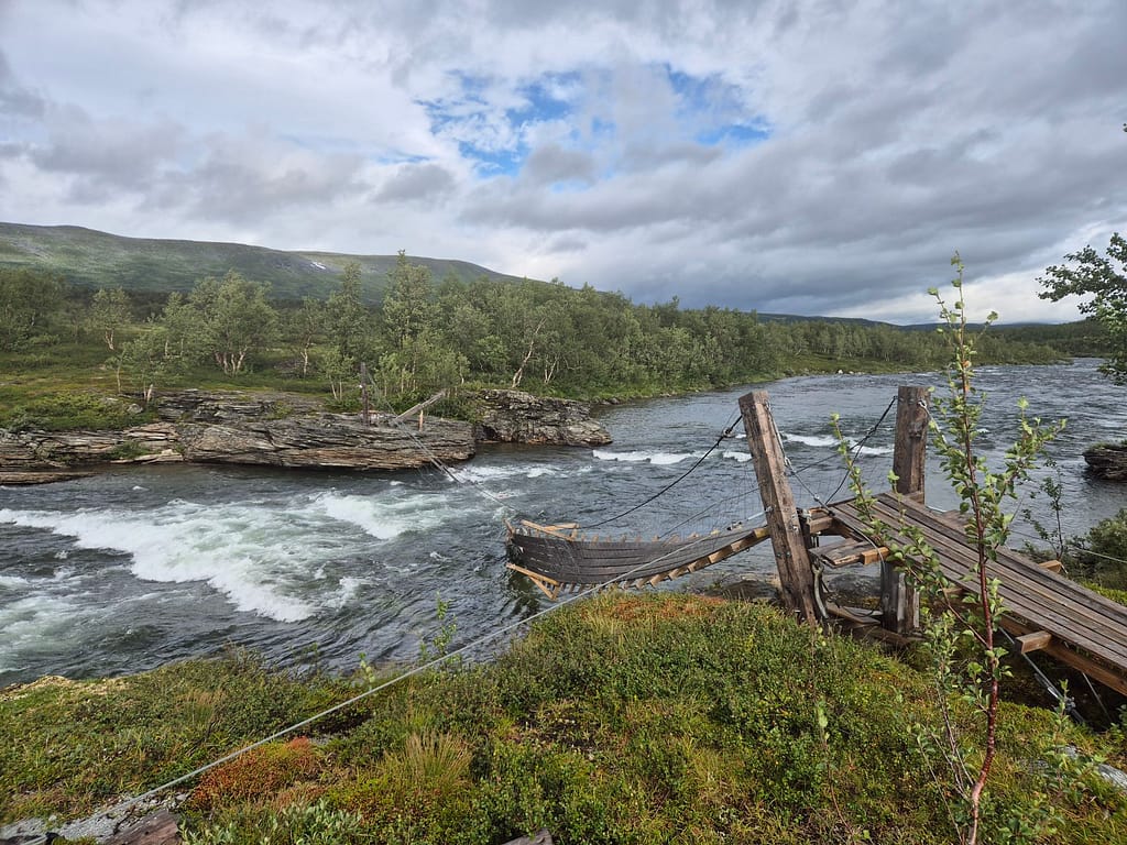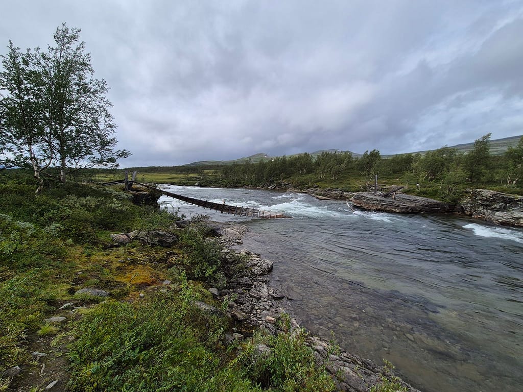 Ved Tiplingelva er det en bro som markerer starten på Børgefjell fra nordsiden. Det jeg ikke hadde fått med meg var at denne var blitt tatt av uvær i vinter og var helt ødelagt. Det ble derfor enda en solid vading. Det var en del strøm og bunnen på sekken kom tidvis litt ned i elva. Jeg kom meg likevel over uten for store problemer. På dette punktet var jeg litt lei av gjennomvåte klær.