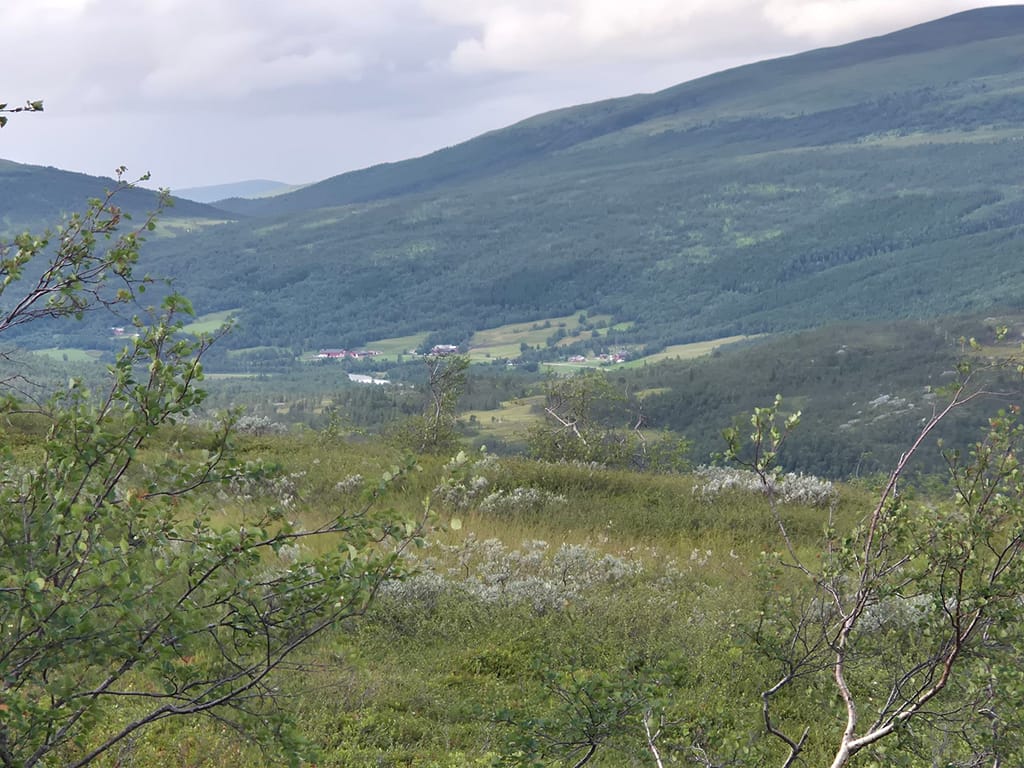Fra andre siden av elva gikk det sti den siste mila ned til Susendalen. Her var det mye klopper og det var en drøm å gå. Etterhvert ble det nok opphold og små solgløtt til at klærne fikk tørket. Det var hærlig å gå over Susna elva på en fin og solid hengebro før jeg kom opp til grusveien Harvassdalsveien. Siste stykket denne dagen ble langs vei frem til Bergum/Møteplass Børgefjell.