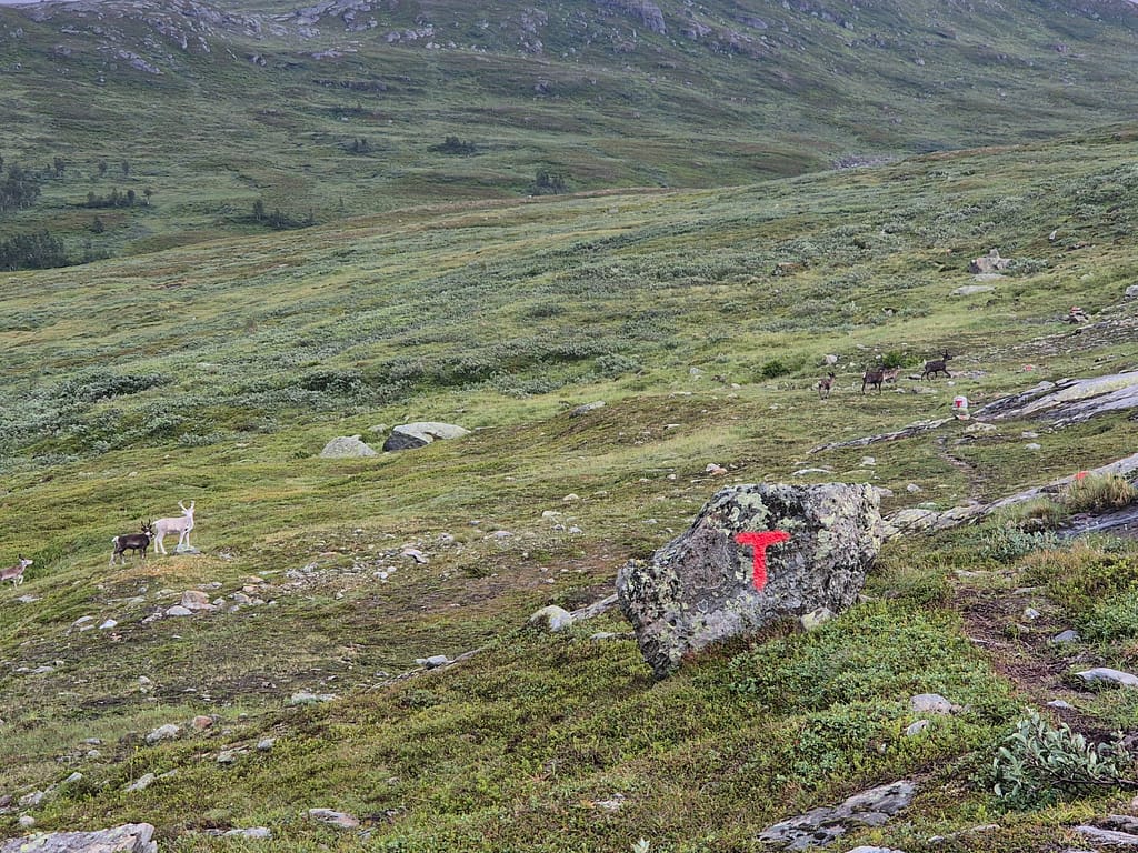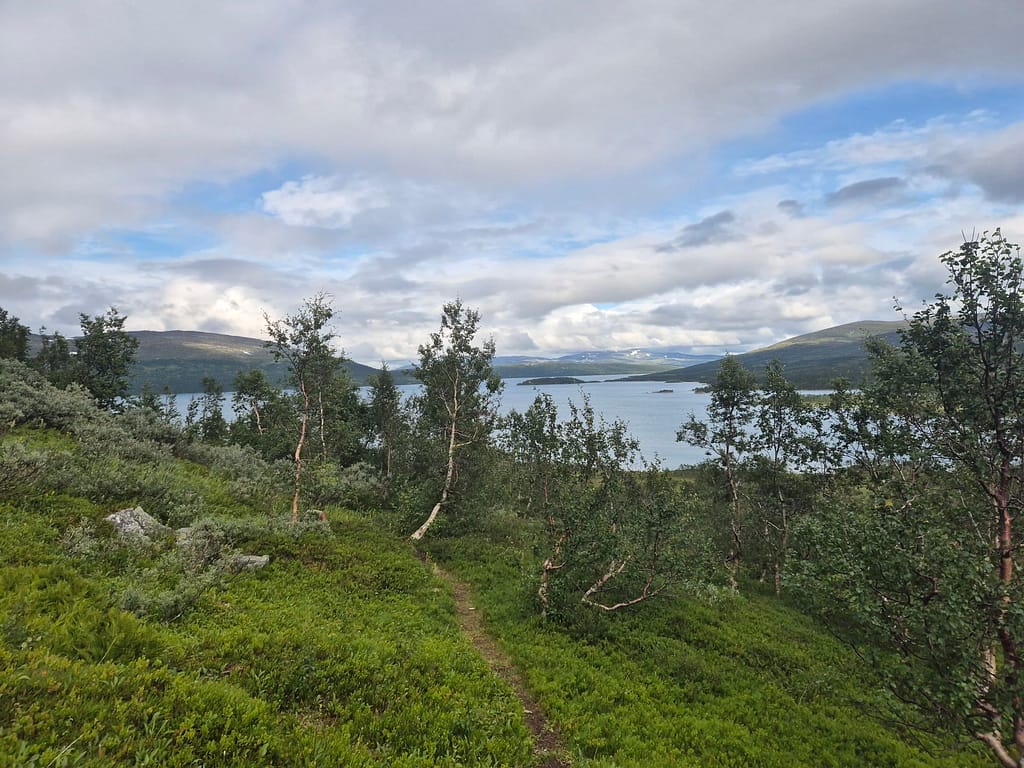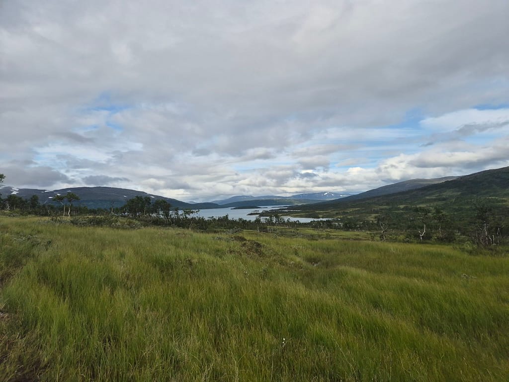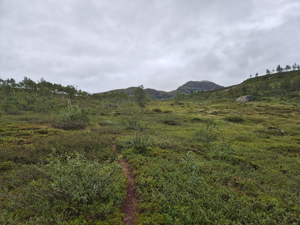 Dagen startet med nedoverbakker til Raudlia/Nordbukta. Jeg fikk telefondekning på den lille veistrekningen langs vannet før stien gikk oppover igjen mot Artfjellet innover Spjeltfjelldalen. Det var en grei stigning og fint terreng. Jeg satte pris på at ruta var lagt langs fjellsiden fremfor nede i dalen.