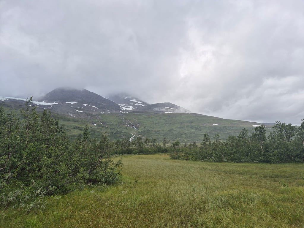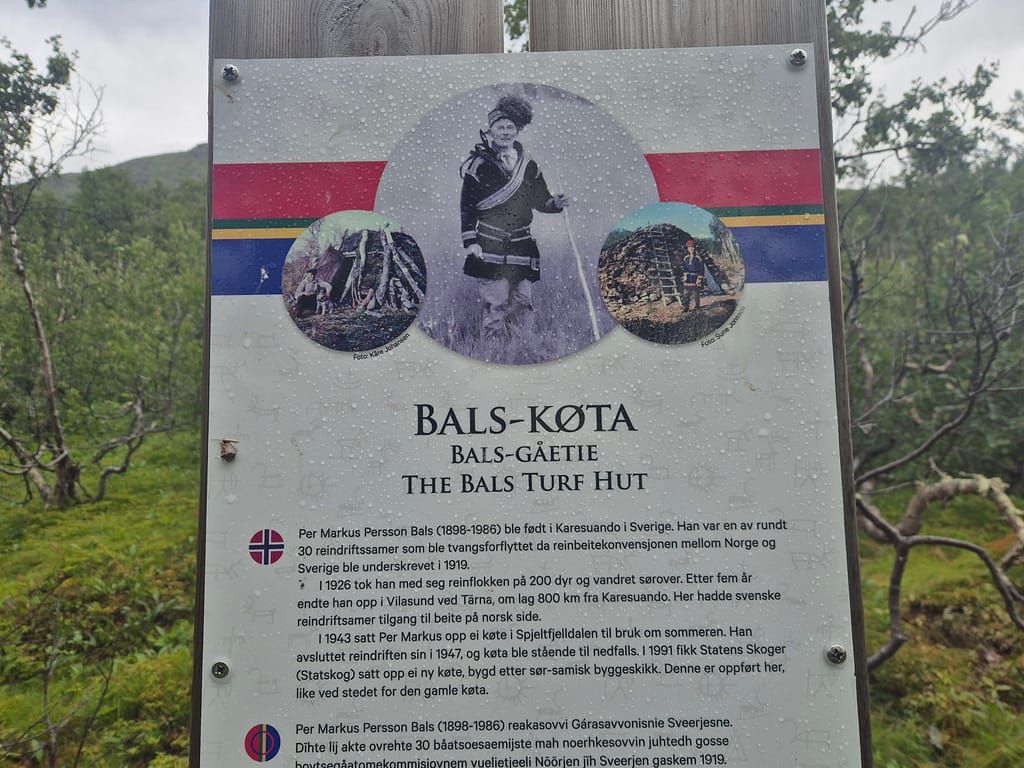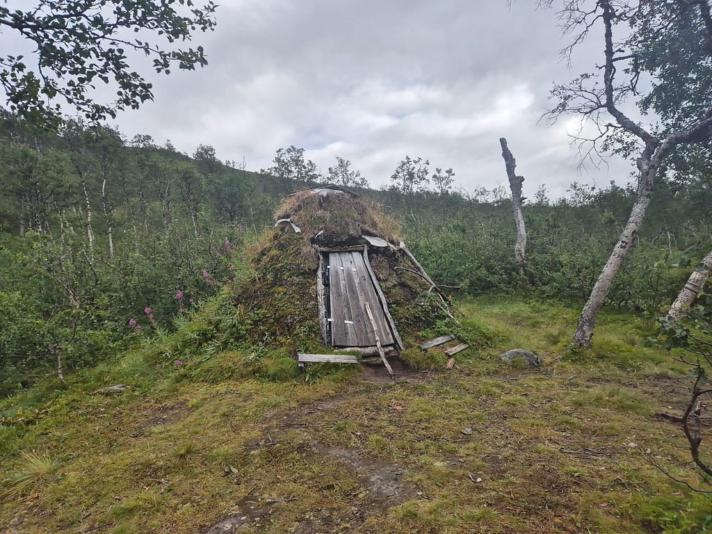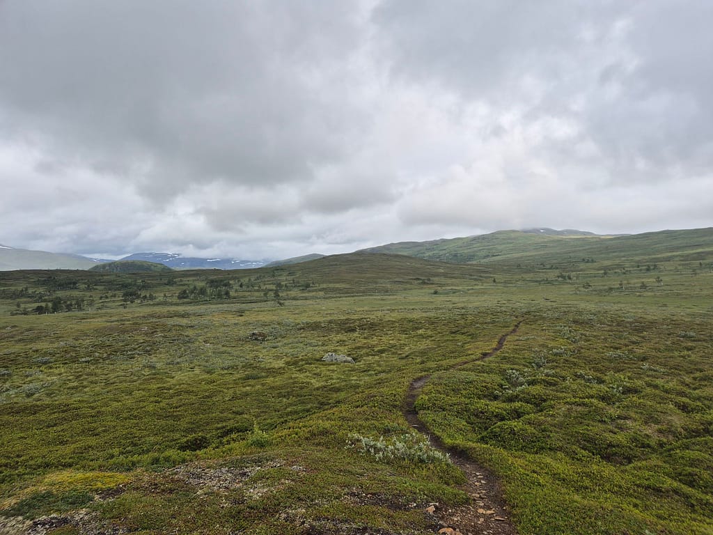 Også i dag møtte jeg på en del regn. Det ble en fin marsj innover dalen med en flott utsikt mot den massive Okstindan. Utover dagen passerte jeg Spjeltfjelldalskøta. Dette er en køte bygd av Statskog etter samisk skikk. Den overtok etter en gammel samisk køte kalt Bals-Køta som var blitt brukt i forbindelse med reindrift i området.