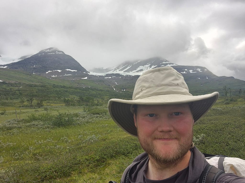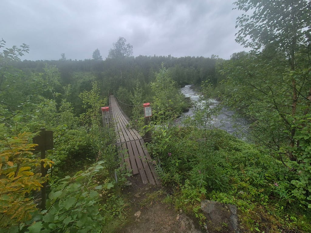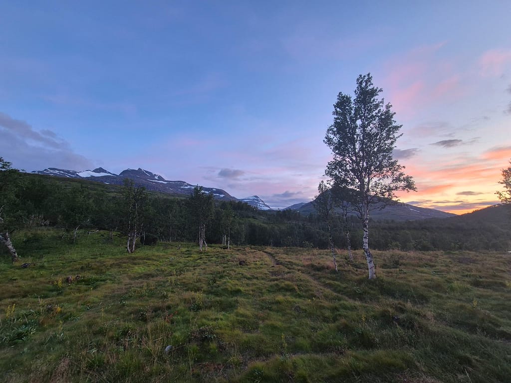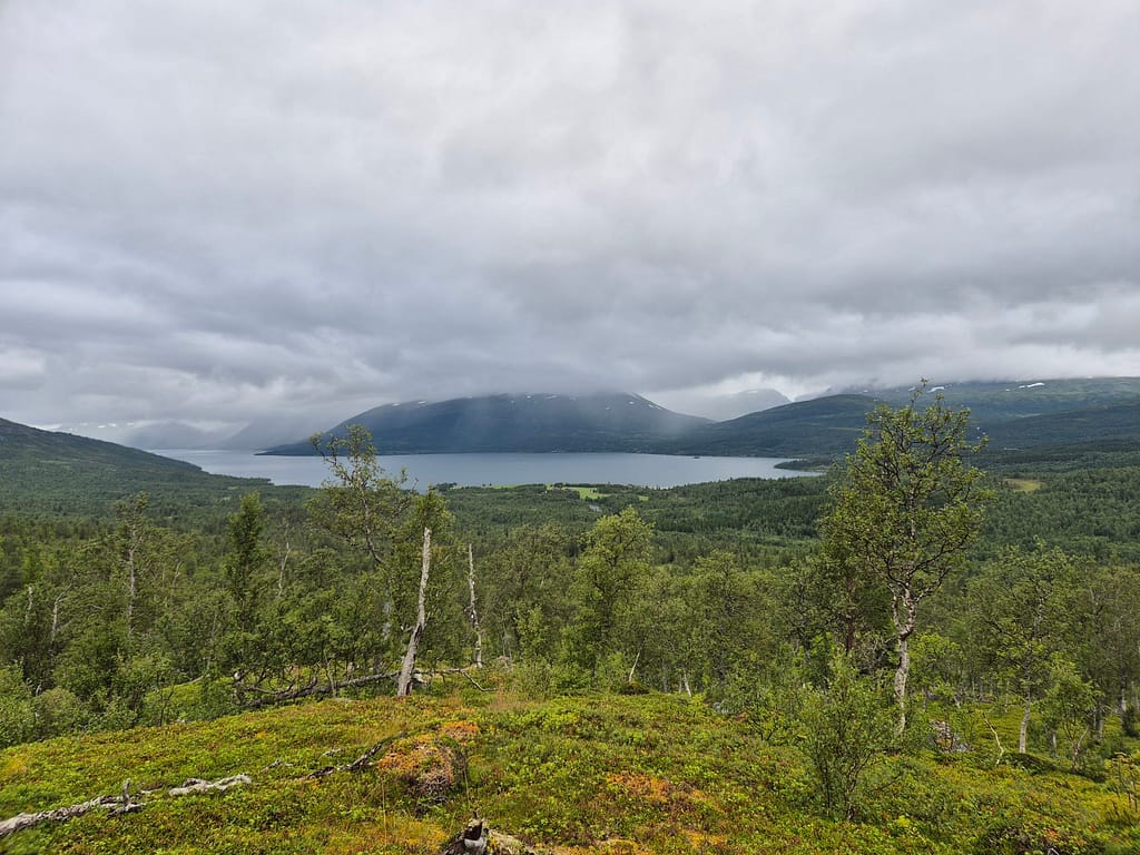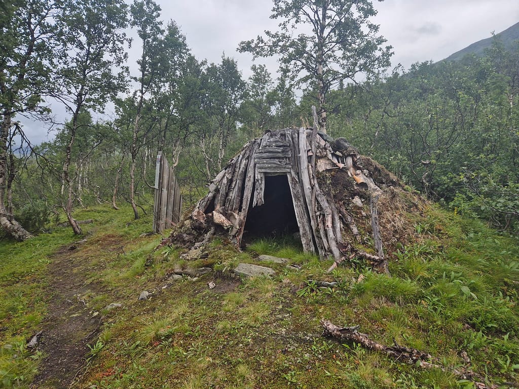 Også i dag møtte jeg på en del regn. Det ble en fin marsj innover dalen med en flott utsikt mot den massive Okstindan. Utover dagen passerte jeg Spjeltfjelldalskøta. Dette er en køte bygd av Statskog etter samisk skikk. Den overtok etter en gammel samisk køte kalt Bals-Køta som var blitt brukt i forbindelse med reindrift i området.