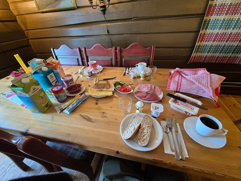 Dagen startet med en solid frokost kl. 08:00. Med brød, rundstykker, egg, yoghurt og annet så ble det spist Med god appetitt. Jeg spiste sammen med Helena og faren som også går Norge på langs. Sist jeg møtte henne var på Sulebu i Skarvheimen.