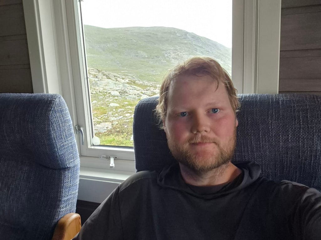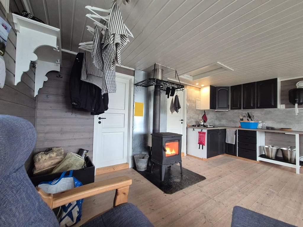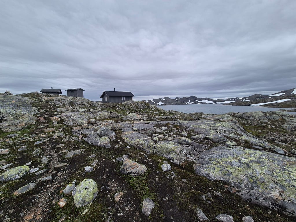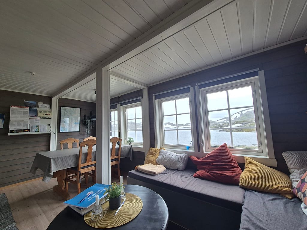 Sauvasshytta var veldig pen og fremsto som ny eller nyoppusset. Fra hytta var det en flott utsikt mot snøflekkede fjelltopper og ned til Østre Sauvatnet. Litt senere kom Kristoffer også på hytta som jeg hadde møtt sist i Blåfjella/Skjækerfjella nasjonalpark. Det er gøy å se igjen andre som også går Norge på langs og høre hvordan det har gått.