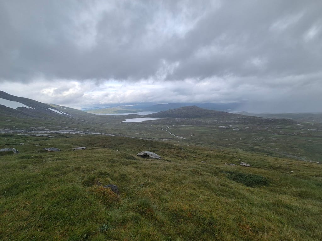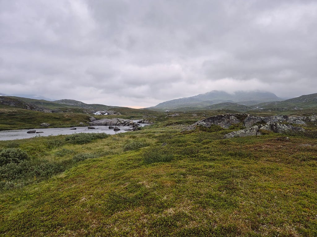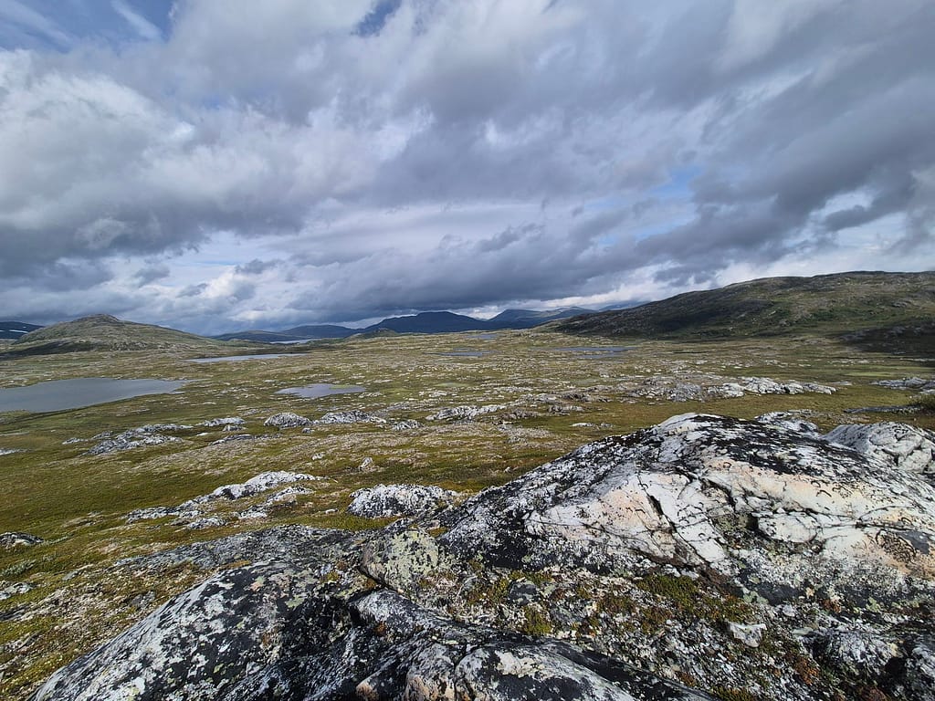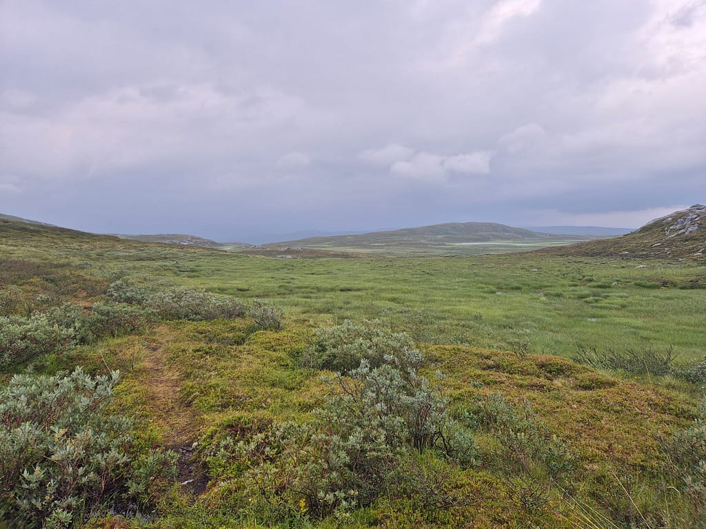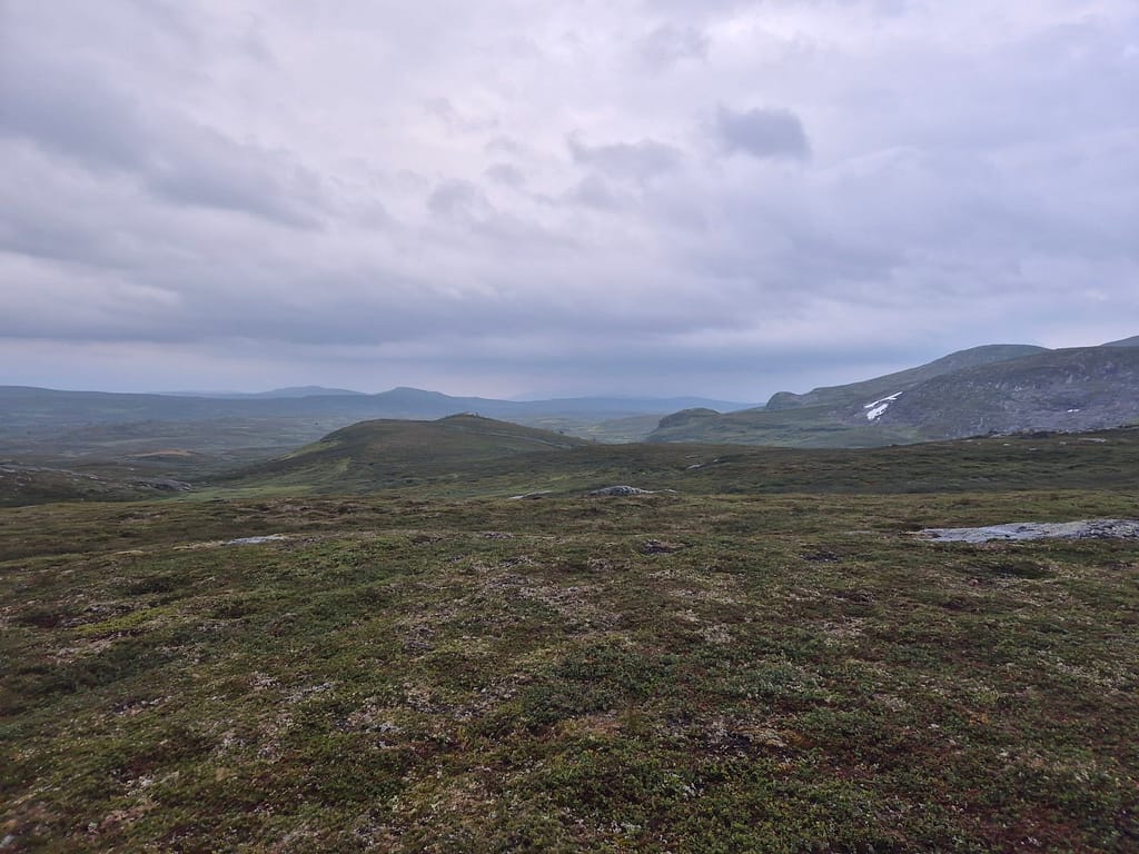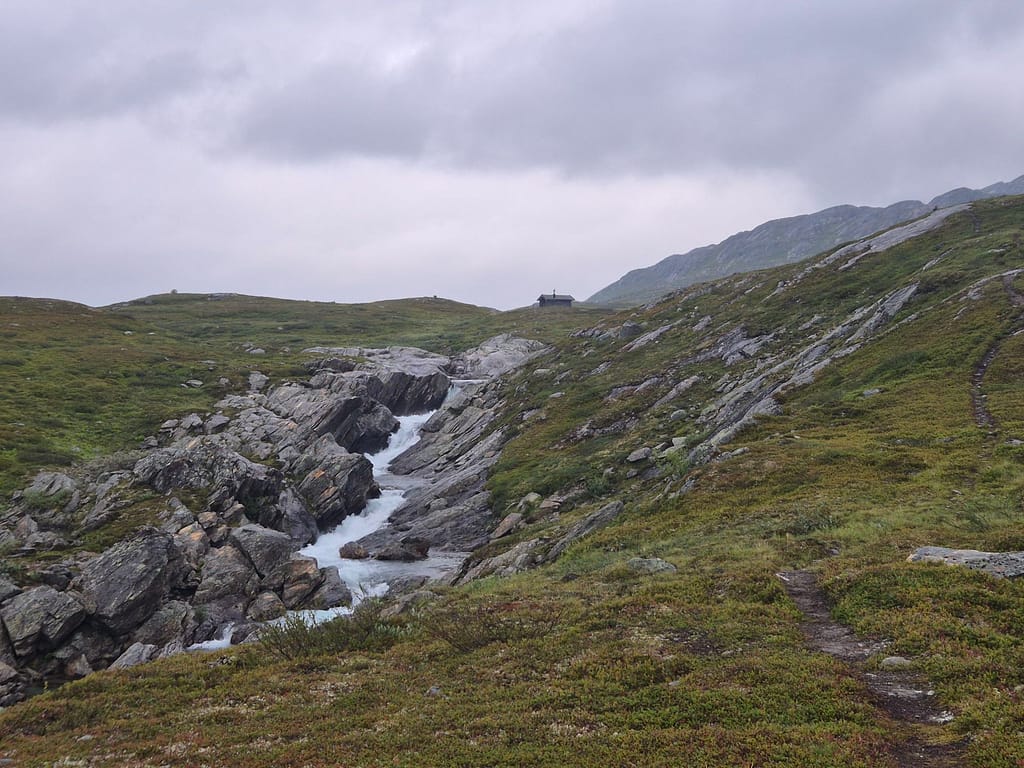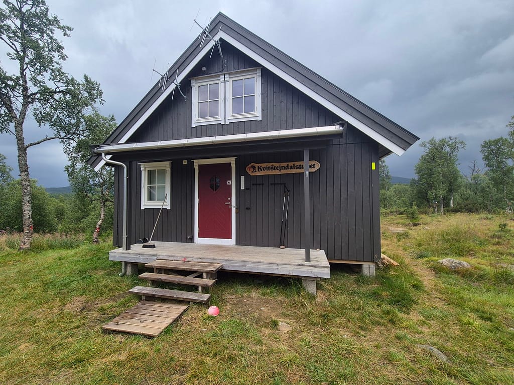 Jeg spiste lunsj på DNT hytta Kvitsteindalstunet før jeg fortsatte vandringen. Herifra var det fint og relativt lettgått terreng frem til DNT hytta Virvasshytta. Det regnet en del så det var likevell ganske vått. Underveis så passerte jeg en DNT nødbu, Kvepsendalskoia. Ettersom det ble en kort dag i går så hadde jeg bestemt meg for å gå på og ta igjen litt tid. Jeg gikk derfor rett videre da jeg kom til denne bua. Omkring 6 km før Virvasshytta så passerte jeg også Vardfjellkåta som eies av Statskog.