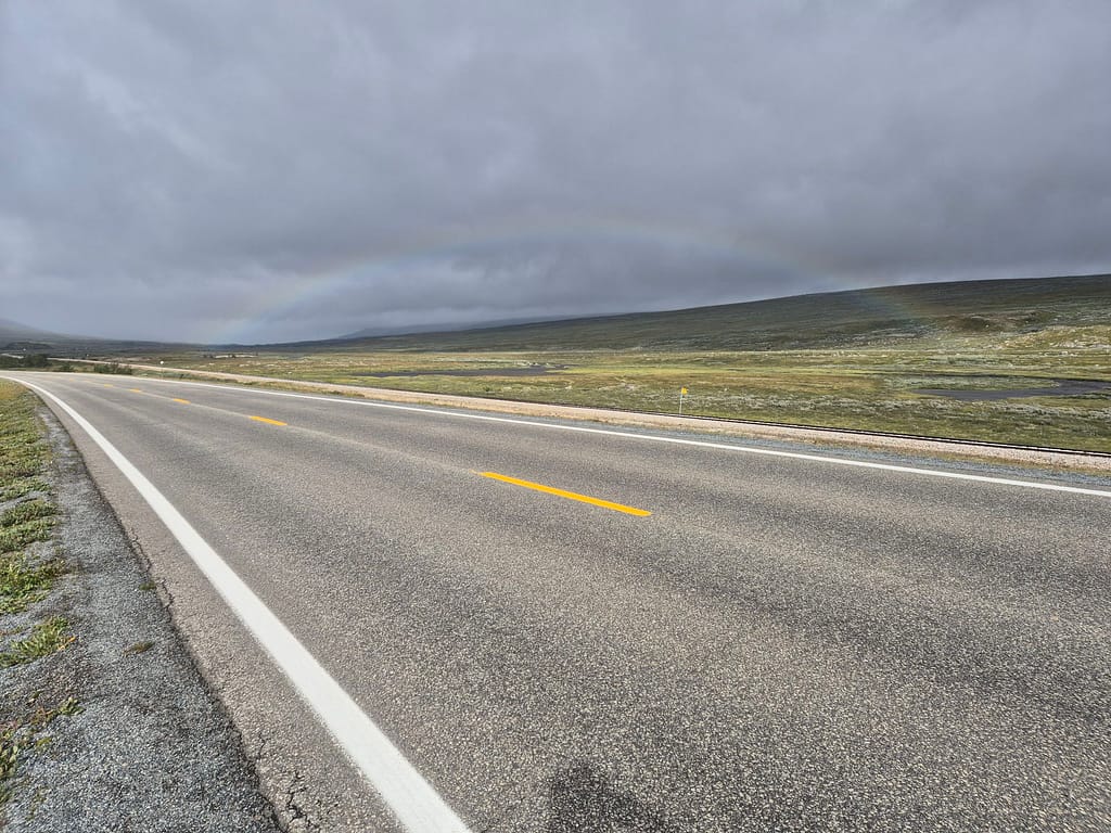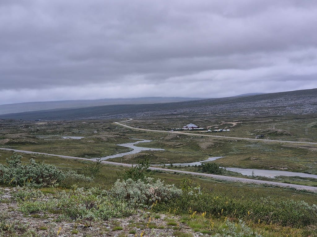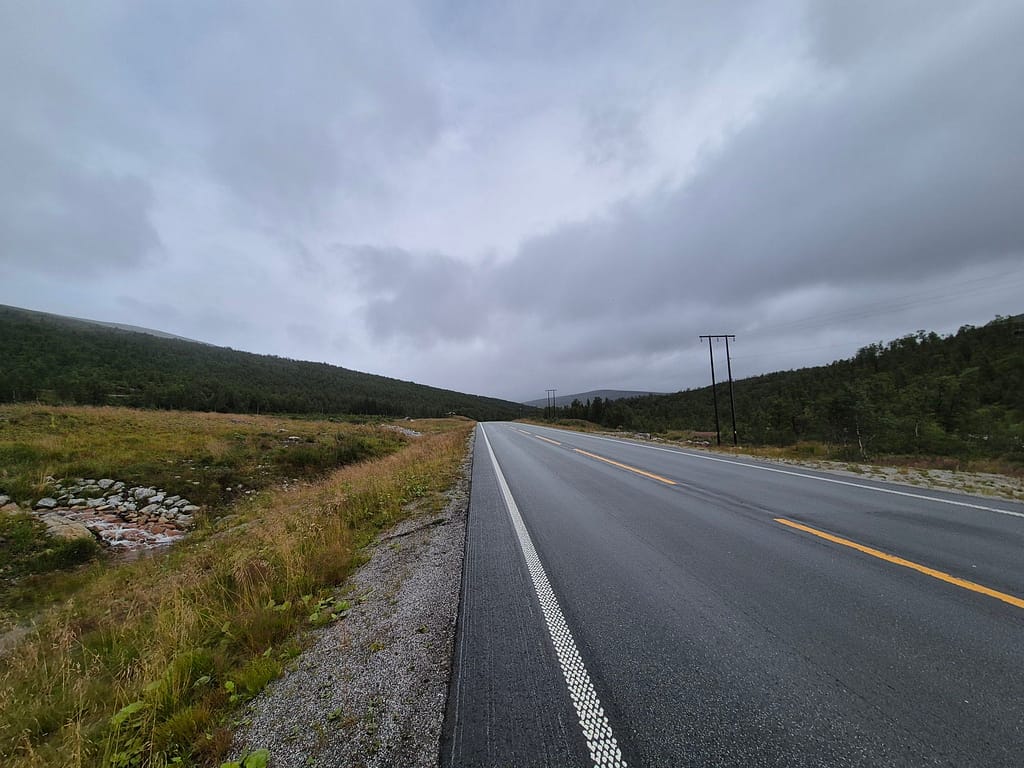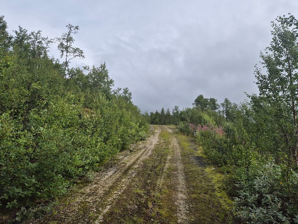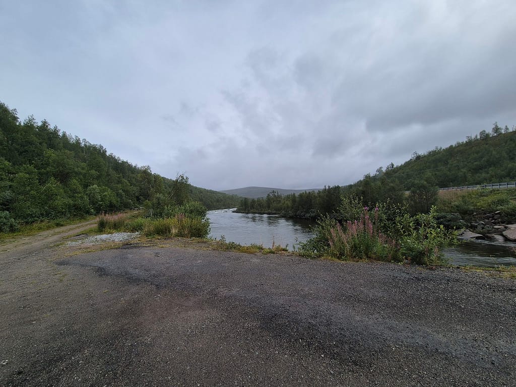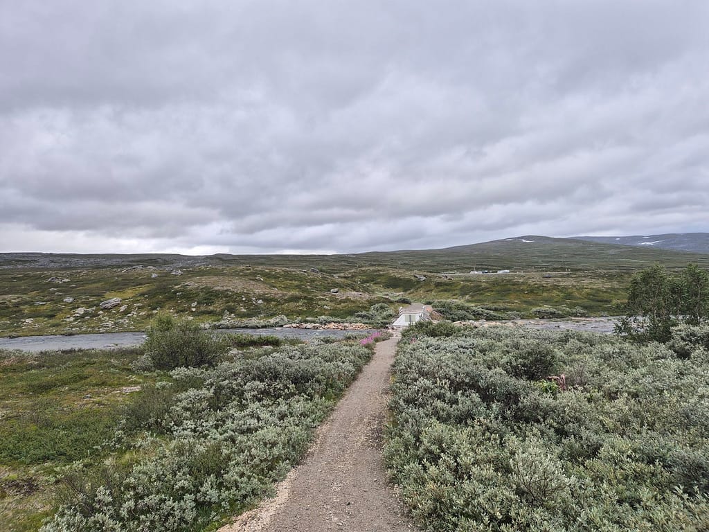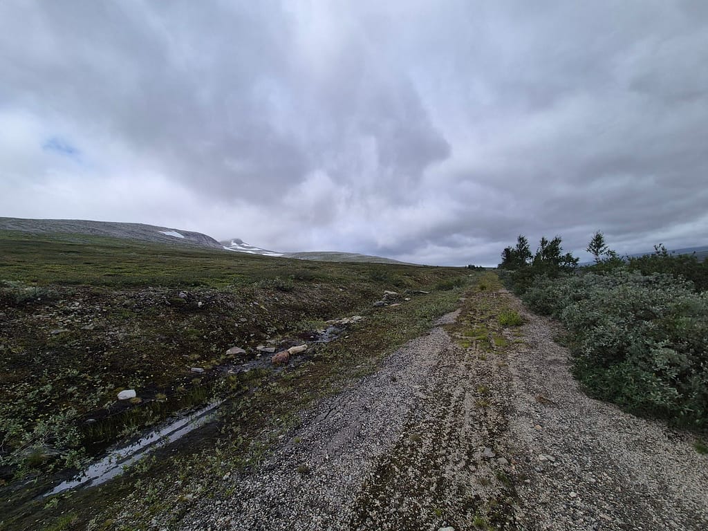 Etter polarsirkelsenteret så fulgte jeg stort sett E6 resten av veien til DNT hytta Lønsstua. Det var tidvis enkelte firhjulingspor på siden av veien som jeg fulgte. Det har tidligere vært støpt broer over elvene. Når det nå kun er fundamenter igjen så ble elvene knotete å krysse. Jeg endte derfor tilbake langs E6 hver gang jeg forsøkte å følge disse sporene.
