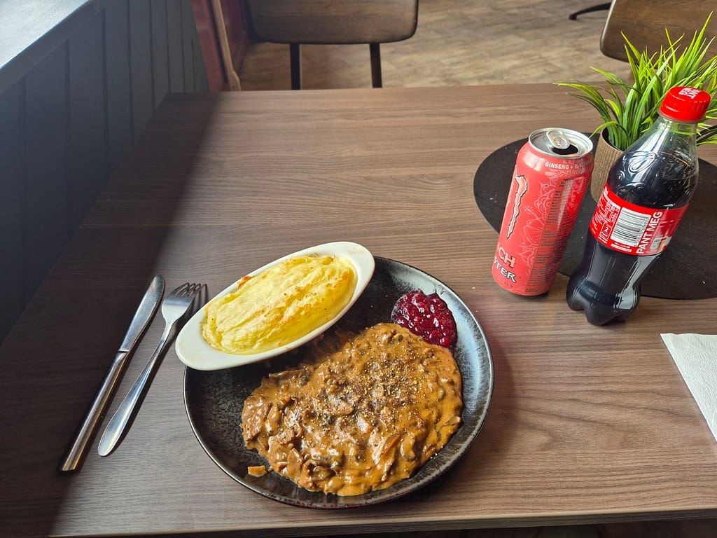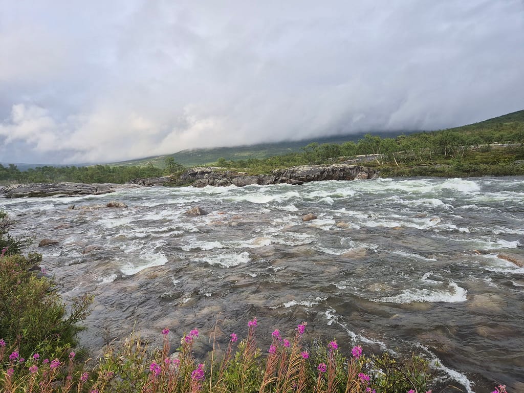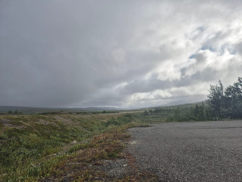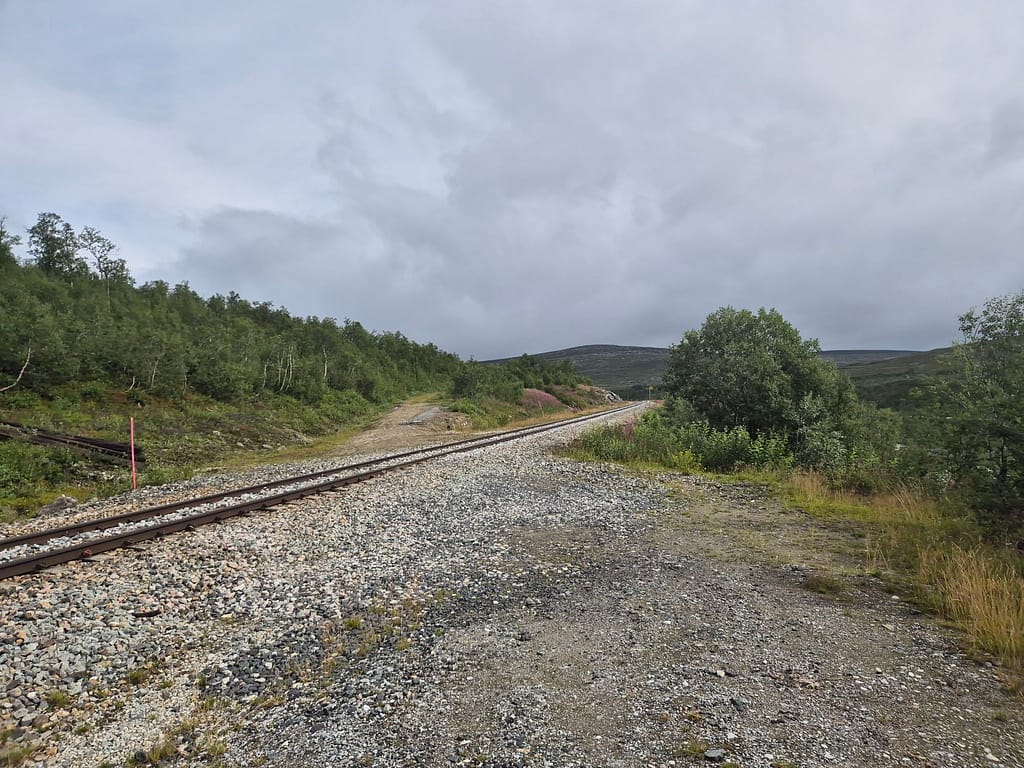 Etter en god natt startet jeg vandringen kl. 11. Valget falt på å følge E6 og gammelveien denne dagen. Dette vil spare meg over 30 km. Ettersom det var kraftig vind og tåkete så ble dette den beste løsningen denne gangen. Jeg kommer også raskere til Sulittjelma hvor jeg vil få nye sko.