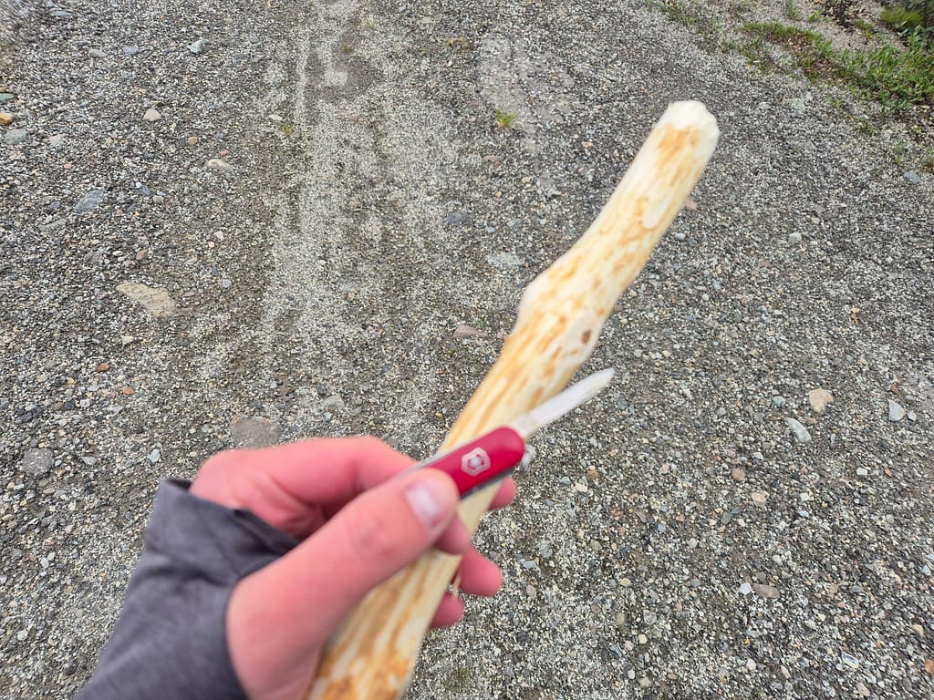 Det var veldig mye vind denne dagen med opp mot 20 m/s i kastene. Det ble derfor tidvis god vinkel mot vinden for å gå fremover. Ellers så endte jeg opp med å lage meg en gåstav av ei fjellbjørk. Dette er det jeg pleide å bruke på fjellturer da jeg var yngre. Det hjelper mye ved elvevadinger. Det tok en del tid ettersom jeg kun har en svært liten Victorianox Classic lommekniv med blad på kanskje 2 cm. Men siden den er såpass skarp så ble det et greit resultat.