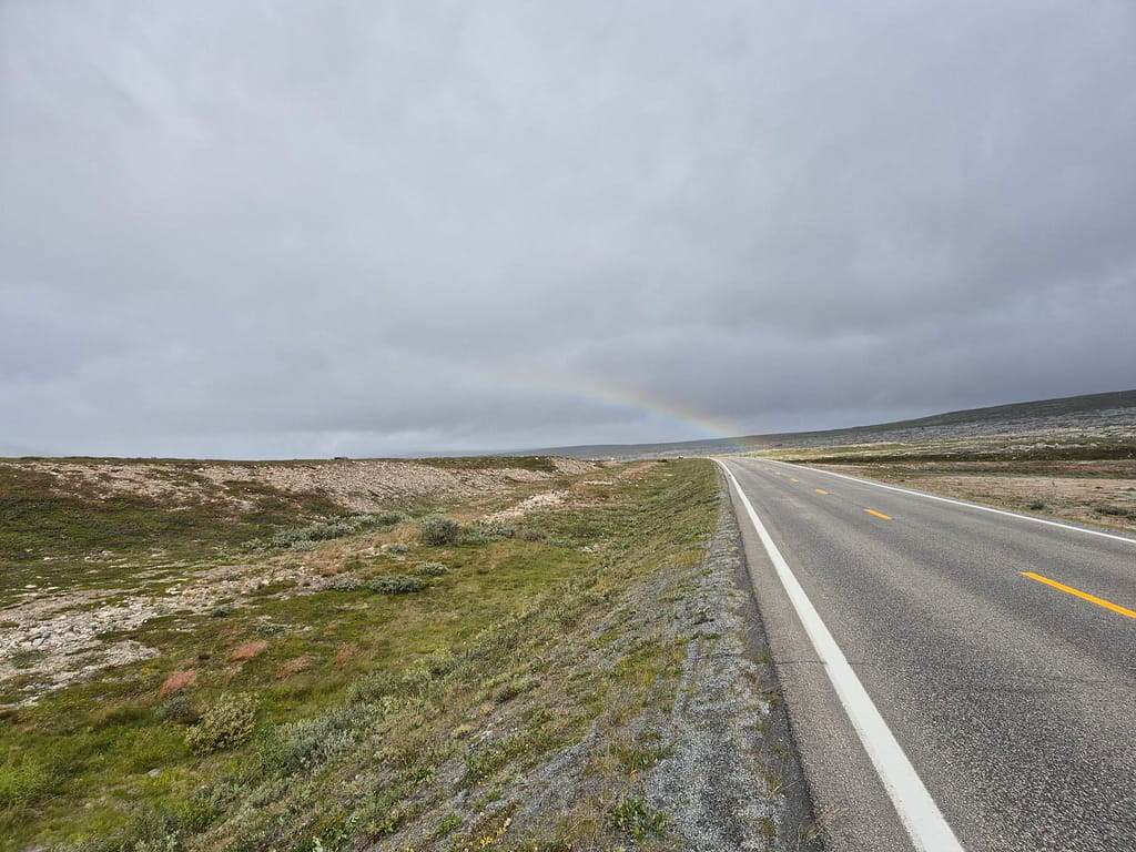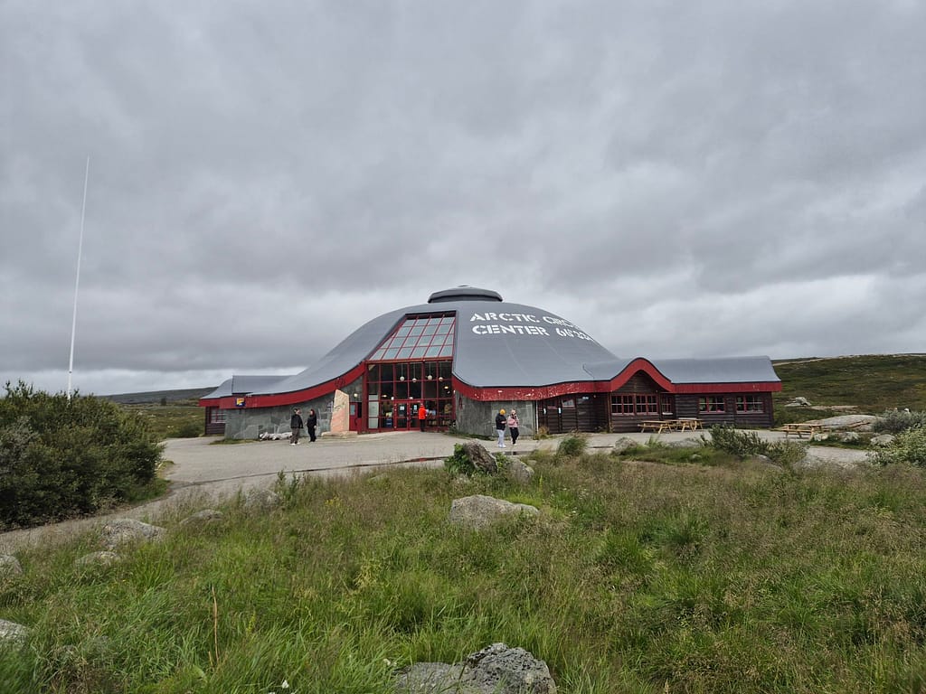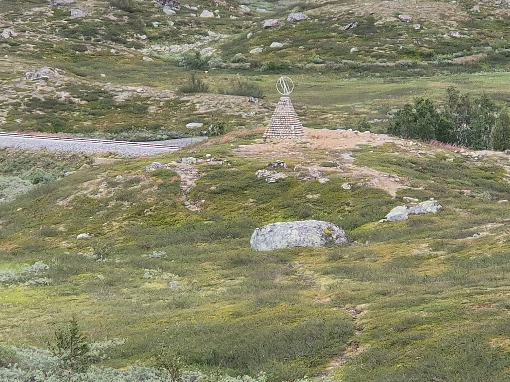 Jeg fulgte gammelveien på oversiden av E6 frem til polarsirkelsenteret. Jeg hadde et lite håp om å få tak i nye gåsraver her, men det var kun turklær i butikken. Det ble en reingryte til middag før jeg fortsatte turen. Polarsirkelen markerer grensen for det området som har mørketid og mid- nattsol. Midnattsol betyr at solen er over horisonten hele døgnet i en periode på sommeren. Jo lenger nord du drar, jo lenger periode med midnattsol.