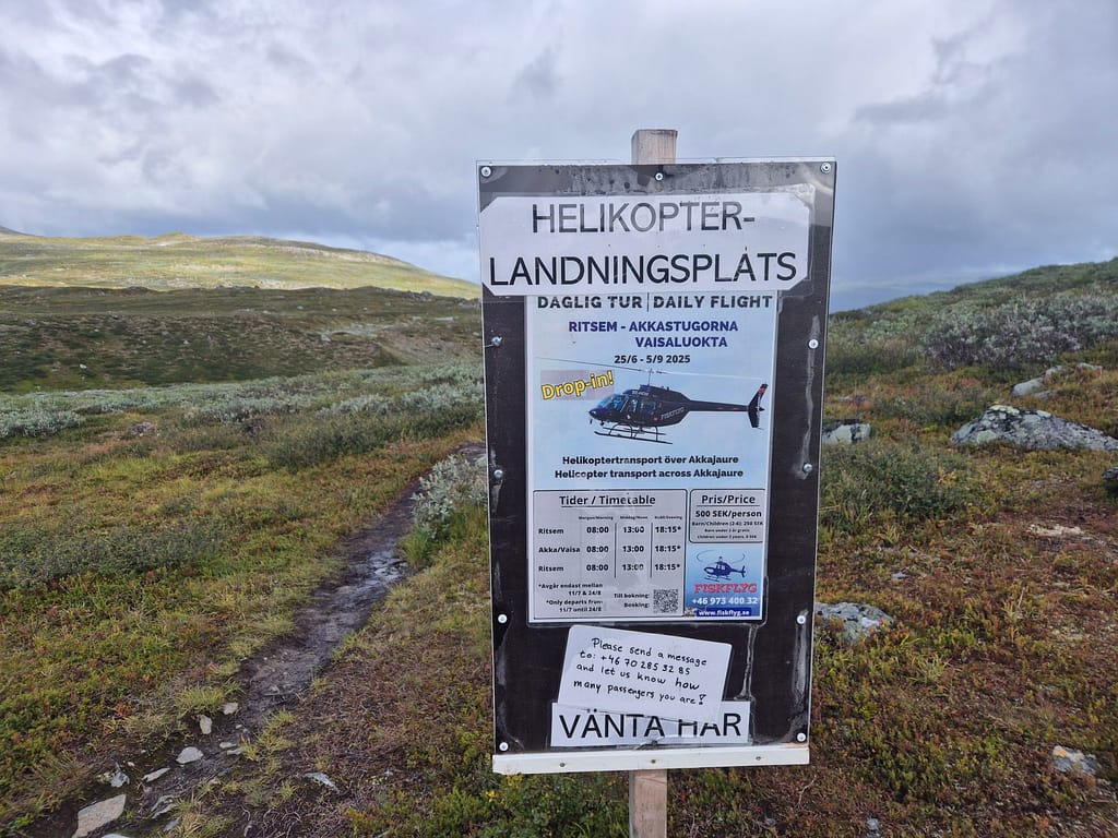 På vei ned fra fjellet passerte vi en landingsplass for helikopter. Dette kan man ta til Ritsem for ca 500 SEK, eller man kan ta båten for 350 SEK. Det står man skal kontakte et nummer for å gi beskjed om at man skal ha transport og antall personer, men det var ingen dekning. Snodig opplegg. I Vaisaluokta så var det en sameby med flere flotte jordgammer.