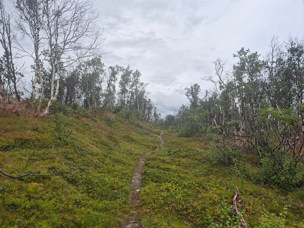 Allerede fra hytta var det mye dårligere sti. Det var gamle såpeglatte planker, skog og enkelte overgrodde partier. Det var likevell gode broer over elvene. Etterhvert tok regnet meg igjen og det ble vått og kaldt. Jeg kom til en nødbu ved Rávddajávrre. Her var det utedo så jeg bestemte meg for å teste en natt i en slik bu. Disse svenske nødbuene er enkle buer med brisker uten madrasser. Det er heller ingen vedovn så det er enkleste sort for ly.