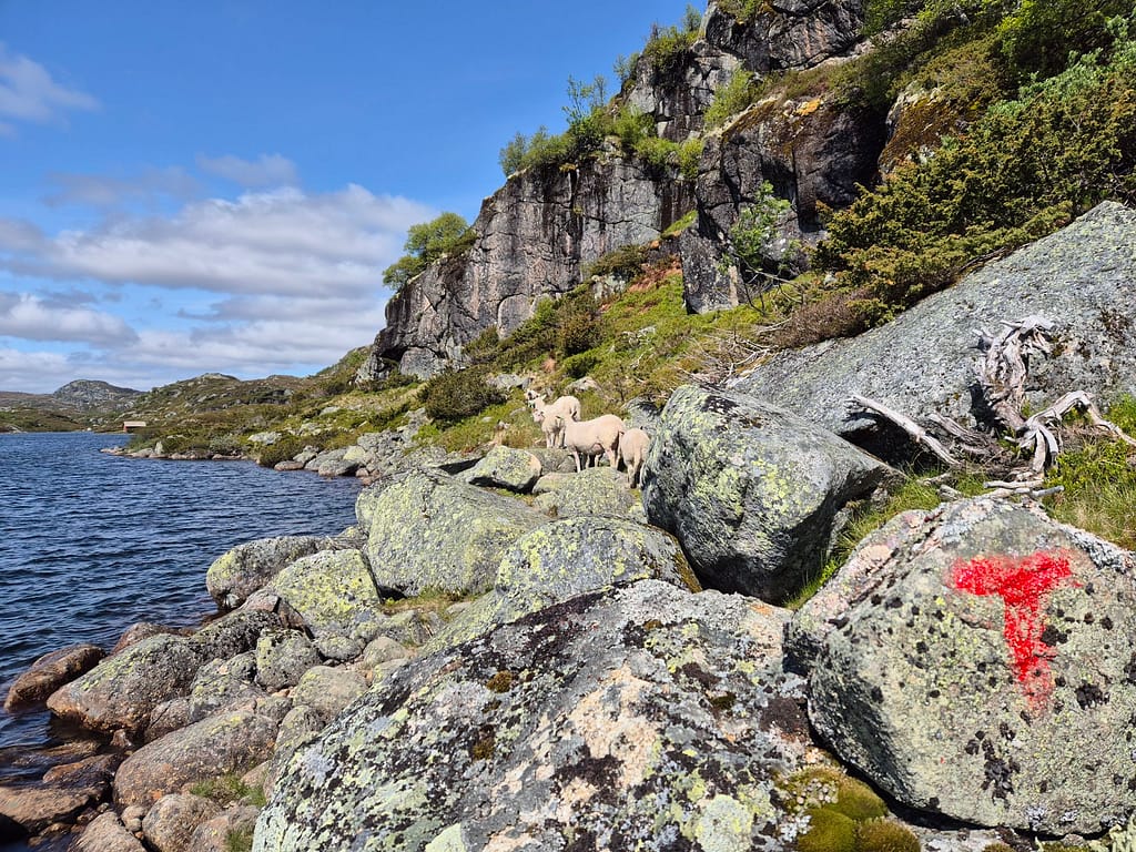 Rundt 7-9 km før neste hytte Øyuvsbu møtte jeg på en trivelig gjeng. Jeg ble invitert bort for en prat og fikk høre om deres tradisjon med vårslipp av sauer i fjellet. Dette er en sterk kultur som går langt tilbake. Her blir også barna tatt med opp til fjells for å oppleve dyrenes møte med naturen etter en vinter med omsorg. Der er tydelig at dette betyr mye for folk her. På en liten halvøy hadde de samlet over 300 sauer. Det ble også nevnt at det finnes flere titusen sauer i området. Jeg ble også invitert til å sove i en liten bu som skal ha stått der i over 100 år. Dette var veldig generøst, men siden det var så fint vær så valgte jeg å gå videre.