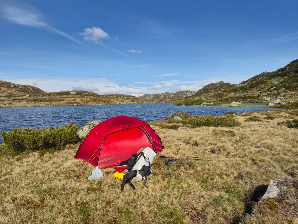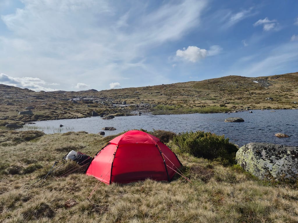 Jeg slo opp teltet med et lite vann ca 4,5 km før Øyuvsbu. Her ble det et lynraskt bad før jeg tok kveld i teltet.